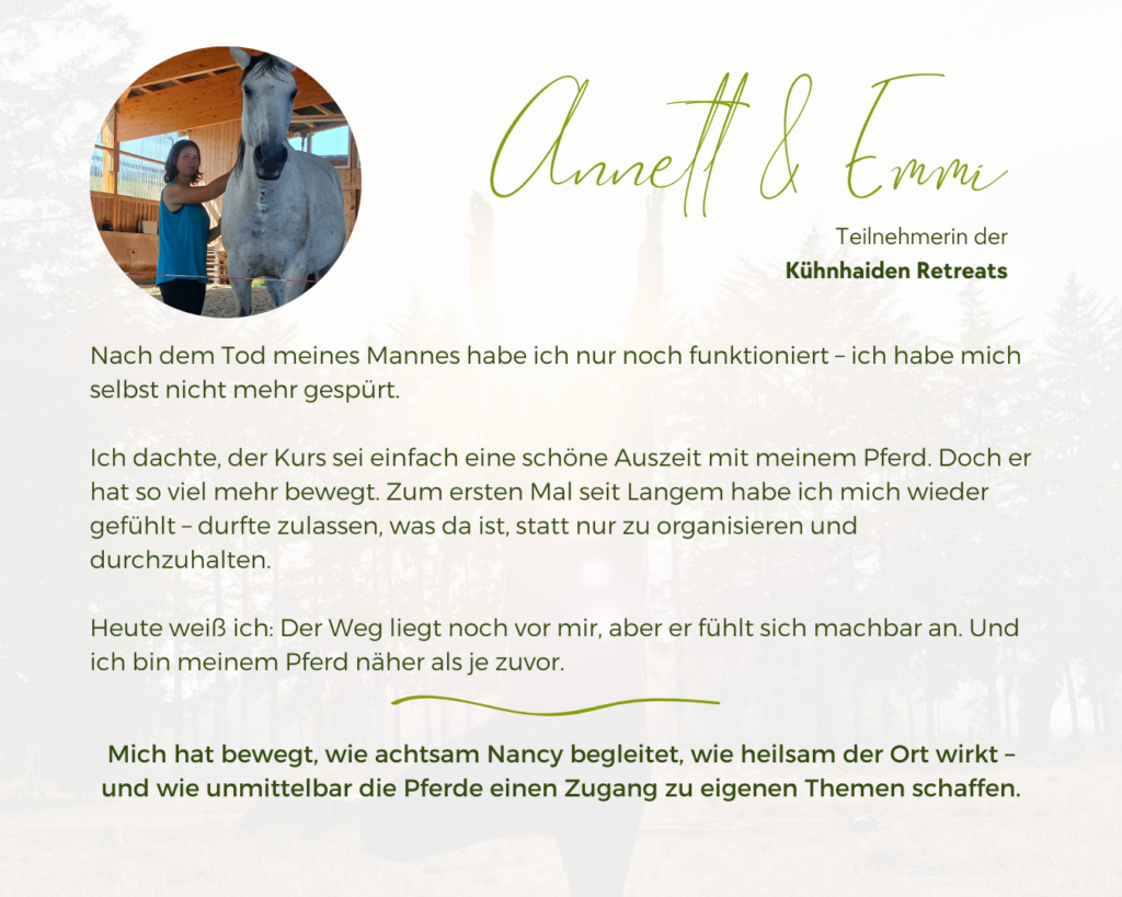 Das Kühnhaiden Retreat lädt dich ein, in einer kleinen Frauenrunde tief durchzuatmen, anzukommen und dich von der Pferdeherde und der Natur tragen zu lassen.